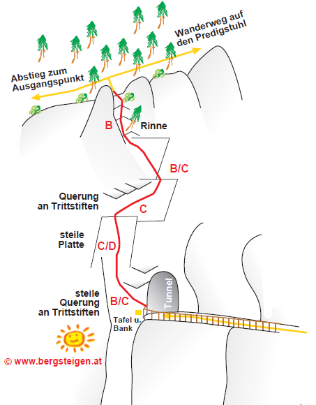 Nástup: Od chaty Rathluck jdeme po široké cestě číslo A2 směrem na Ewige wand. Cesta začíná v lese a pokračuje tunely ve skále na skalní římse přímo ve stěně. V tunelech je osvětlení na solární panely.