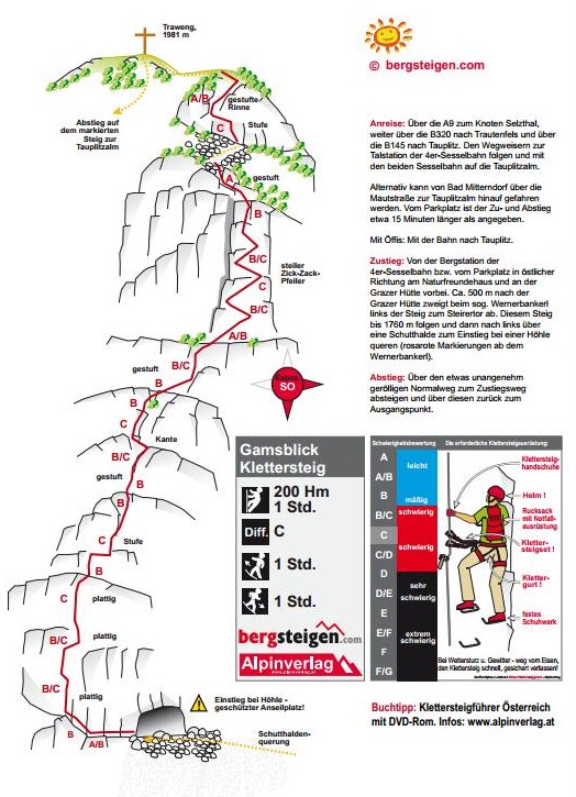 Nástup: Ferrata zatím není na turistické mapě, ale je uvedená na letáku v informacích a je velmi dobře značená přístupová trasa. Cesta vede po značení z parkoviště kolem jezer Groβsee a Tauplitzsee. Nad výhledem na jezero Steirersee je odbočka doleva. Cesta se začíná zvedat a končí štěrková cesta. Cesta se vine až pod sedlo Steirertor apotom uhýbá doleva pod skalní masiv. Celý nástup je cca. na 1 hod a 45 minut. Nástup na lano je ve výšce 1770 m.n.m.
