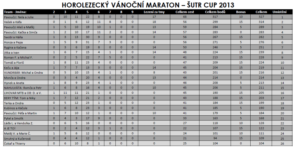 Na horolezecké stěně Šutr se v sobotu odehrála bezvadná předvánoční "lezba" dvojic.Cílem závodu bylo vylézt co nejvíce cest v časovém intervalu cca 5h s tím že se posledních 40 minut lezlo za tmy pouze s čelovkou.