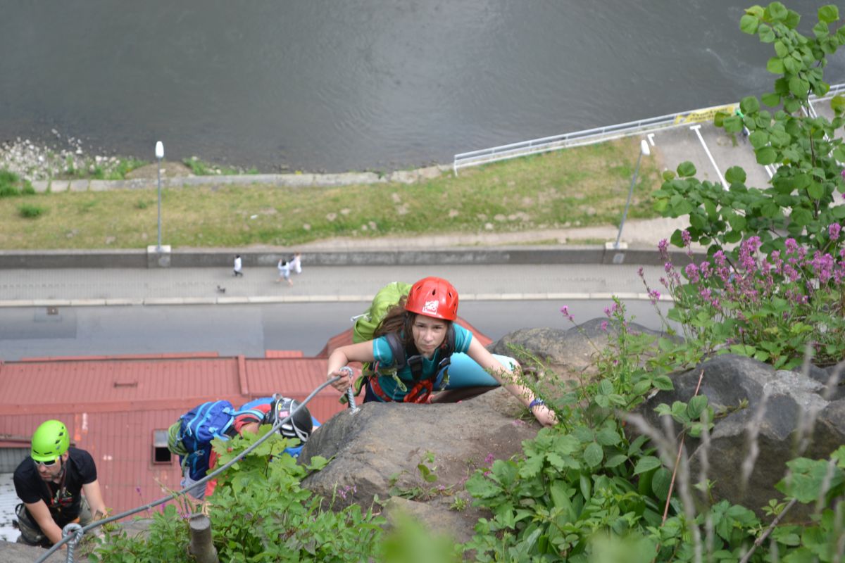 Už na nádraží v Liberci jsme dostali lezecké vybavení - sedáky, prsáky, helmy a ferratové úvazky. Ty jsme sbalili do batohů a vydali se vlakem do Děčína. Z hlavního nádraží v Děčíně jsme asi za 10 minut došli pod Pastýřskou stěnu. Na hřišti pod stěnou jsme potom trénovali přecvakávání úvazků mezi nýty na ferratě.