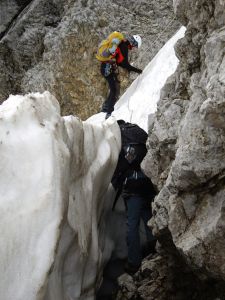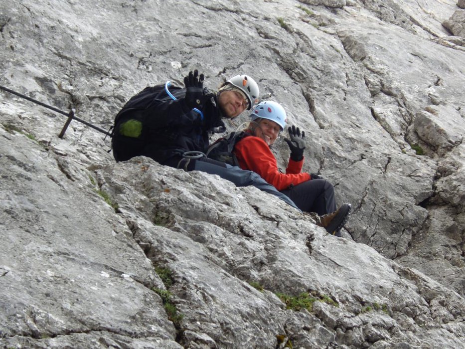 Nástup: Pěšky po cestě číslo 615, na DachsteinSüdwand Hütte (cca 35 minut), kolem chalupy a za chalupou prudce doprava nahoru. Pořád po cestě číslo 615. Cesta se klikatí pod lanama lanovky a přechází na pravou stranu údolíčka. Traverz pod lana a nástup (cca 1,5 hod.). Na skále jsou dobře viditelné redpointy. Problém nastává při nadílce sněhu. Může být i v červenci. Ale začátek lan lze najít. S sebou dojišťovací lano. V jenom místě zůstává sníh i v létě.