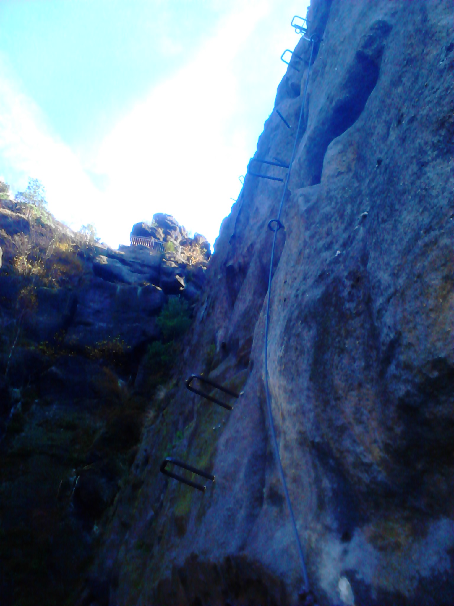 Trasa: Hezká pískovcová ferrata, která prověří vaše lezecké dovednosti. Úvodní část je náročnější. Krásné výhledy na vesnici Oybin. Zakončení vyhlídkou s plošinou i turistické cesty. Lezení pěkné.