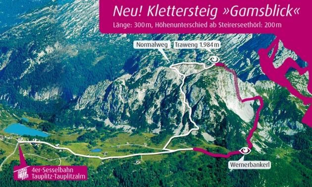 Pěkný klettersteig (ferrata), která se dá zvládnout v klidném tempu za 4 hodiny. Z vrcholu Traweng (1981 m.n.m.) jsou krásné výhledy na Tauplitz a na Totes Gebirge (Mrtvé hory). Velká část ferraty se dá lézt pěkně po skále. Ideální pří pobytu na Tauplitzalm.