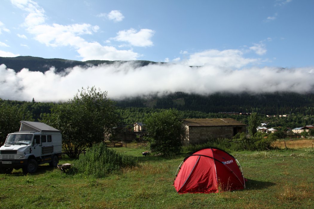 My jsme si vybrali možnost zahrady u místního majitele „kempu“J Meraba. Jeho zahrada je asi 1 km od centra naproti letišti. Výhodou jsou záchody, možnost sprchy a možnost nechat u něho věci. Byli jsme spokojení. Cena byla 5 GEL/osoba/noc. A každý večer s námi pil pivo, které přinesl. Vlastně jsme propili víc než jsme zaplatiliJ.